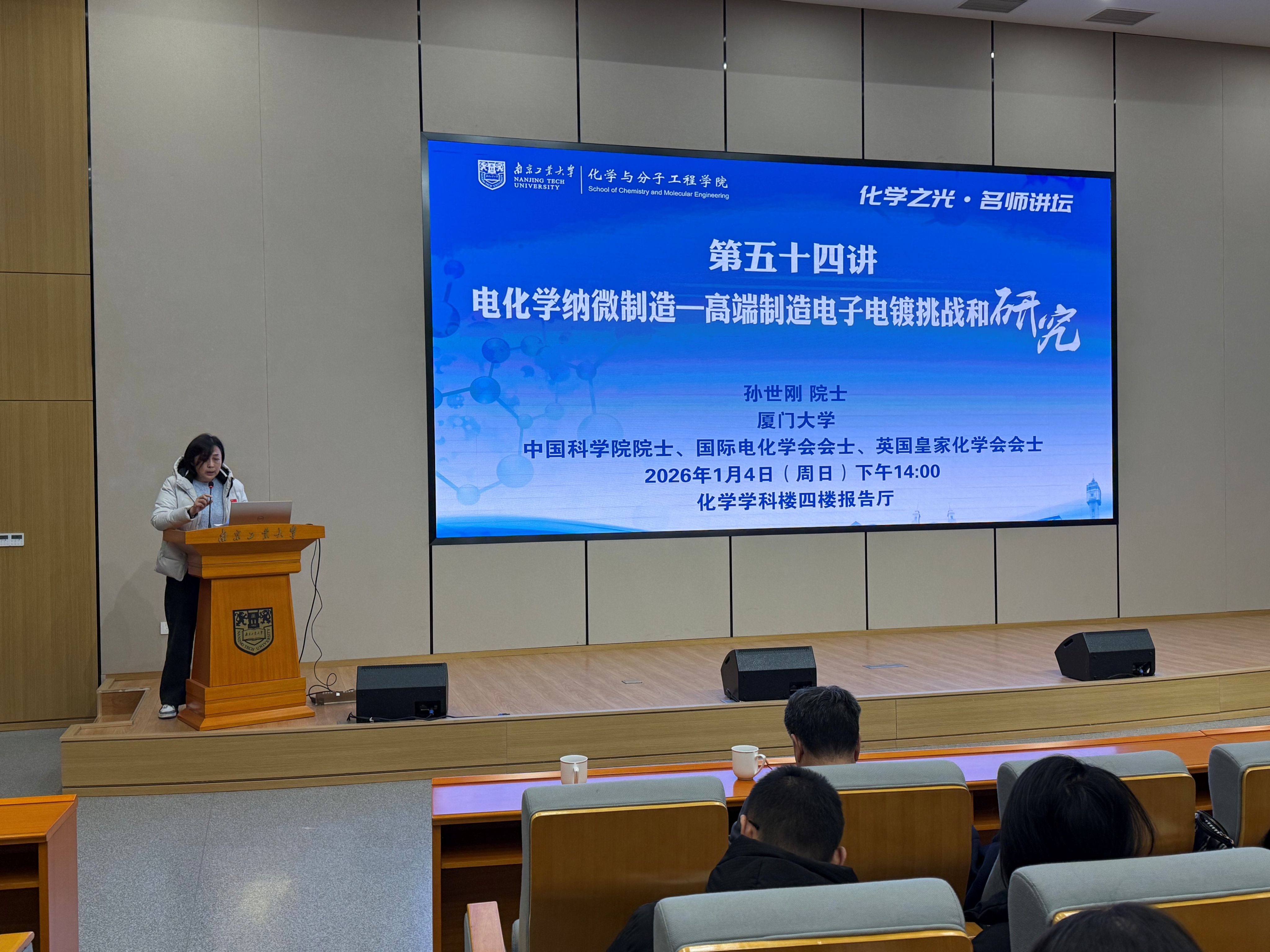 2026年1月4日下午,厦门大学中国科学院院士、国际电化学会会士、英国皇家化学会会士孙世刚院士应邀做客我院“化学之光・名师讲坛”,作题为“电化学纳微制造——高端制造电子电镀挑战和研究”的学术报告。报告会由戴志晖副校长主持,吸引了众多师生参与,现场学术氛围浓厚。