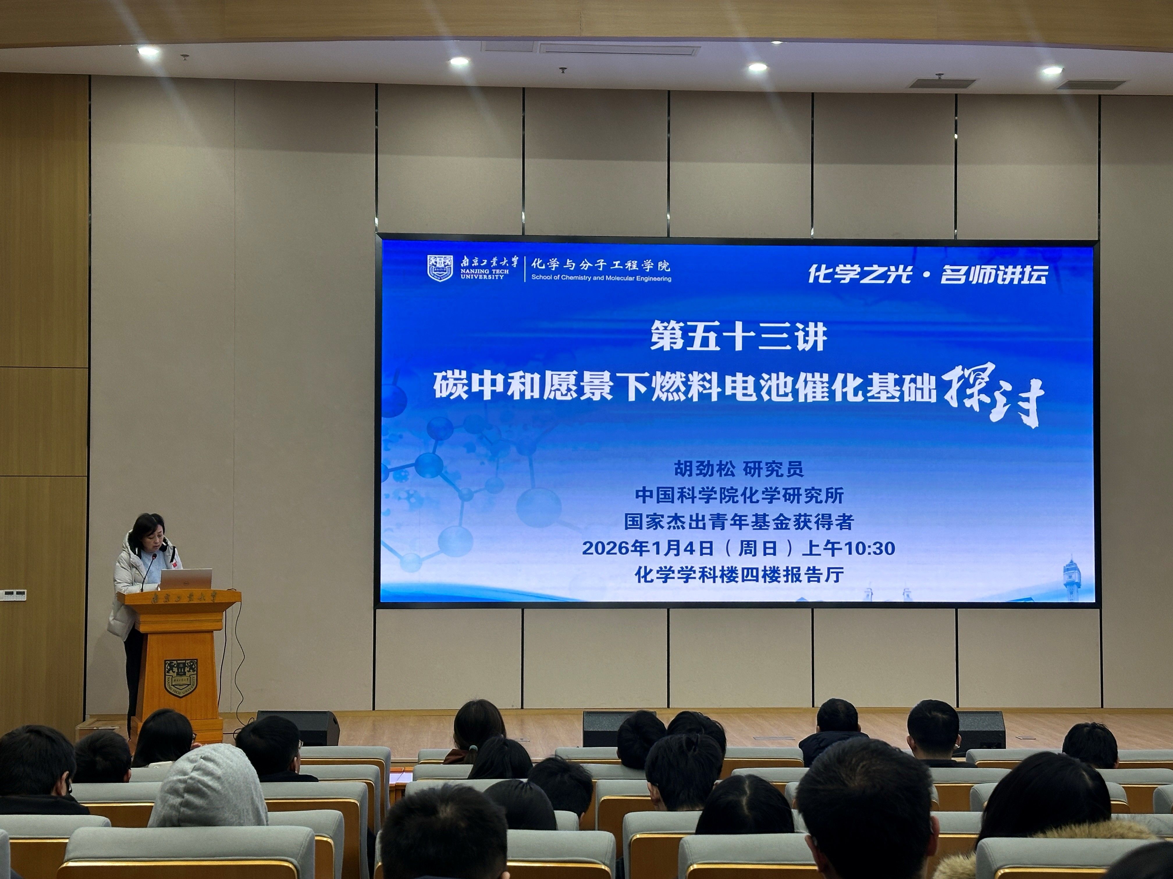 2026年1月4日,我院特邀国家杰出青年基金获得者中国科学院化学研究所胡劲松研究员和南京大学化学化工学院马晶教授做客我院“化学之光・名师讲坛”,分别做作题为“碳中和愿景下燃料电池催化基础探讨”和“人工智能赋能分子与反应设计”主题报告。讲坛由戴志晖副校长、白俊峰教授主持,我院教师、研究生、本科生等100余名师生代表参加了本次讲坛。