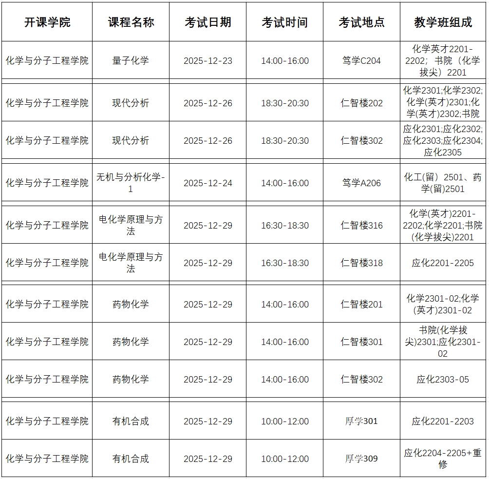 2025-2026(1)《量子化学》《现代分析》《无机与分析化学-1》《电化学原理与方法》《药物化学》《有机合成》期末考试通知